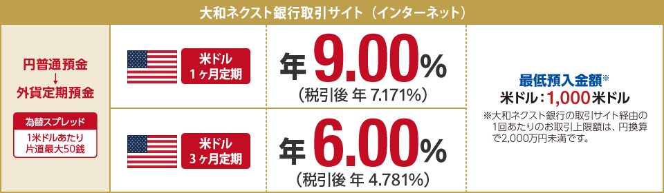 | キャンペーン適用金利 | 米ドル1ヶ月定期預金 年9.00% (税引後年7.171%) 米ドル3ヶ月定期預金 年6.00% (税引後年4.781%) |