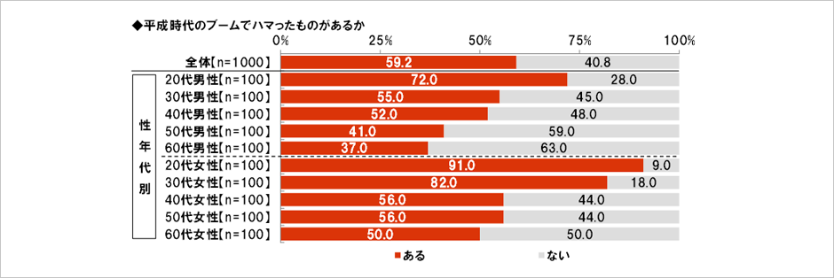 全回答者 (1,000名) に、平成時代のブームでハマったものがあるか聞いたところ、「ある」は59.2%、「ない」は40.8%となりました。