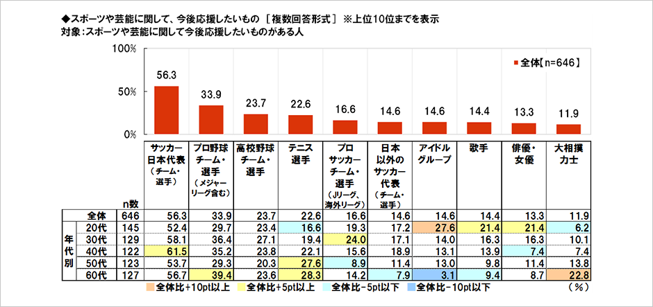 応援したいものがある人 (646名) に、何を応援したいか聞いたところ、「サッカー日本代表 (チーム・選手) 」 (56.3%) が最も多く、「プロ野球チーム・選手 (メジャーリーグ含む) 」 (33.9%) 、「高校野球チーム・選手」 (23.7%) 、「テニス選手」 (22.6%) 、「プロサッカーチーム・選手 (Jリーグ、海外リーグ) 」 (16.6%) が続きました。第100回の記念大会となる2018年全国高校野球選手権大会を楽しみにしている人が多いようです。