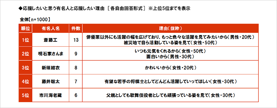 まず、全回答者 (1,000名) に、応援したいと思う有名人を聞いたところ、1位「斎藤工さん」 (13件) 、2位「明石家さんまさん」 (9件) 、3位「新垣結衣さん」 (8件) 、4位「藤井聡太さん」 (7件) 、5位「市川海老蔵さん」 (6件) となりました。