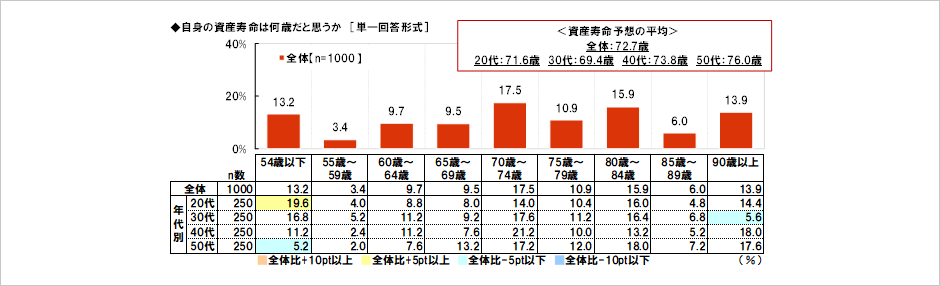 年代別にみると、資産寿命予想の平均は、20代では71.6歳、30代では69.4歳、40代では73.8歳、50代では76.0歳と、健康寿命の予想と同様に50代が他の年代より高くなりました。