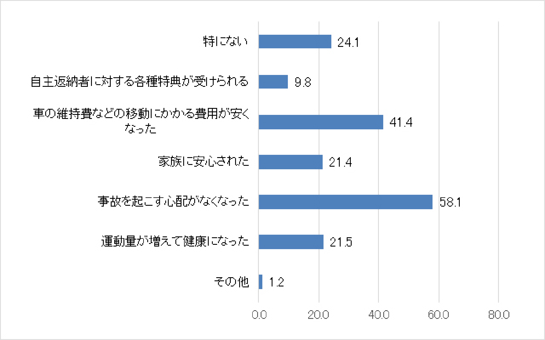 自主返納した1,000人に対するアンケートで、返納してよかったことを聞いたところ、「事故を起こす心配がなくなった」のほか、約4割の方が「車の維持費などの移動にかかる費用が安くなった」と回答しています。