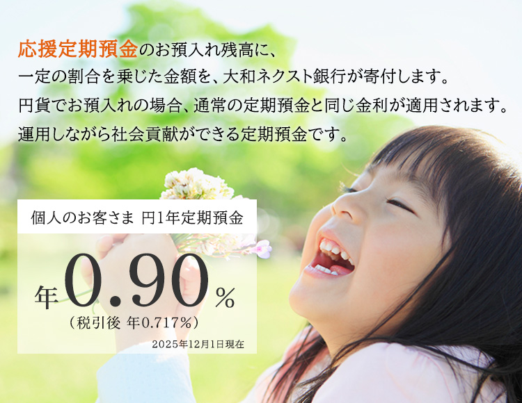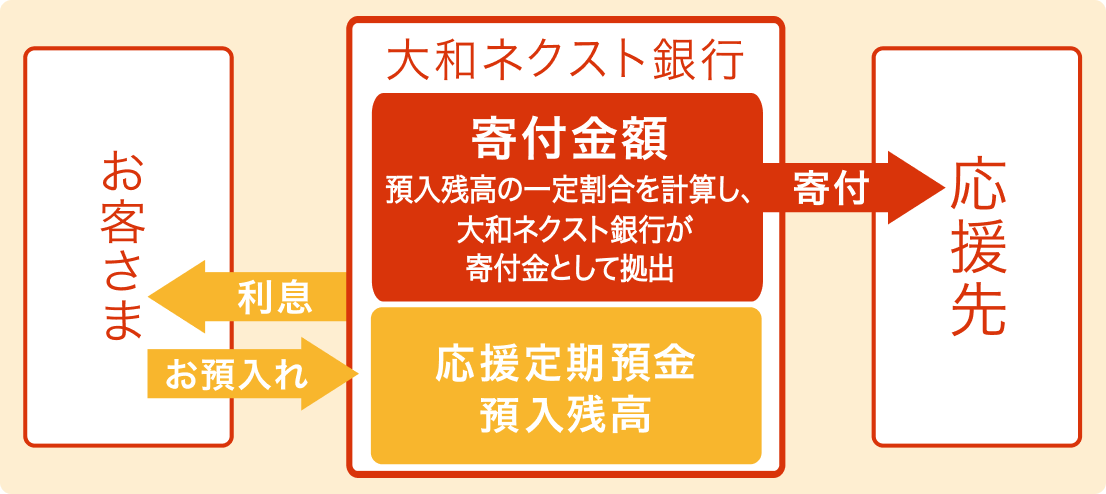 応援定期預金の預入残高の0.01% (取扱通貨円 : 年利換算) および0.20% (取扱通貨米ドル : 年利換算) 相当額を毎月末に計算して累計し、大和ネクスト銀行が4月と10月に応援先へ寄付します。