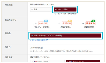 商品種類「えらべる預金」、商品カテゴリ「懸賞定期預金」をクリックの上、商品名から「懸賞定期預金 (為替レート予想型) 」を選択してください。