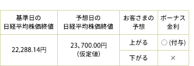 2020年6月30日 (火) (基準日) と比較して2020年9月30日 (水) (予想日) の「日経平均株価終値」が「上がる」か「下がる」かを予想していただき、予想が的中されたお客さまには、ボーナス金利年0.30% (税引後 年0.239%) をプレゼントいたします。