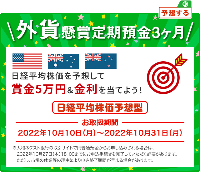 2022年9月30日 (金) (基準日) と比較して2022年12月30日 (金) (予想日) の「日経平均株価終値」が「上がる」か「下がる」かを予想していただき、予想が的中されたお客さまには、ボーナス金利年0.30% (税引後 年0.239%) をプレゼントいたします。