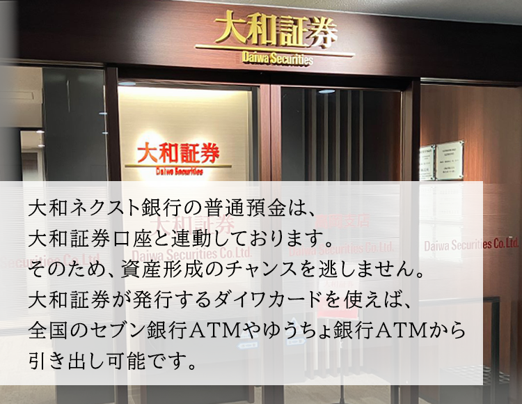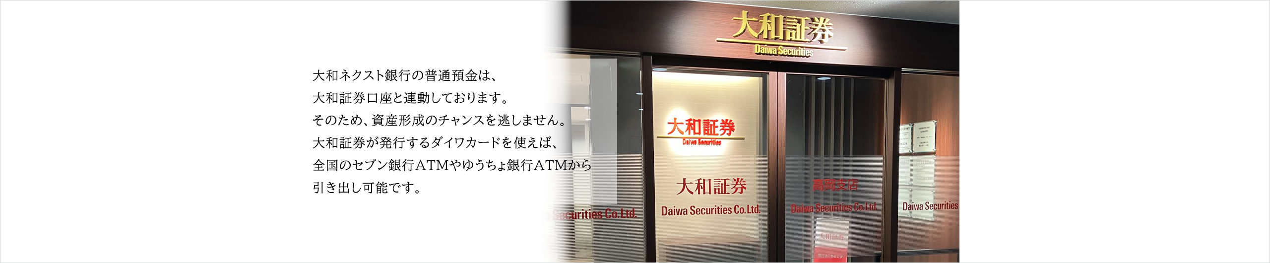 大和証券にお持ちの口座と大和ネクスト銀行の円普通預金口座を連携させることができます。証券取引決済のためのお振り込みの手間をはぶくことができ、効率的に資産を管理することができます。